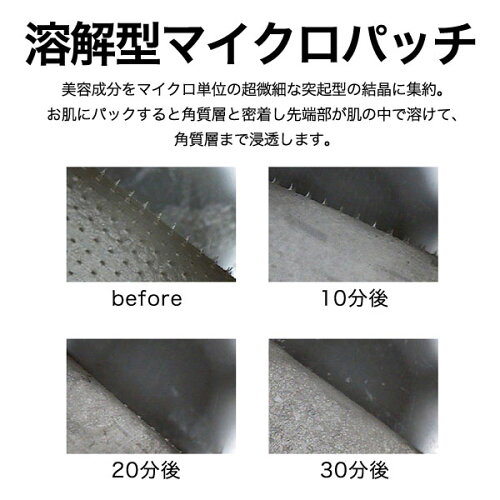 ひとつひとつの小さな構造体の山が、角質層まで入り込み、溶けることでヒアルロン酸を直接肌内部(角質層)まで届けます! 商品名 マイクロアイパッチ1回分(2枚入り) × 2個 使用方法 洗顔後、化粧水で肌を整えたあと、パッチを取り出し、 気になる目もと口もとへ密着するように貼り、そのままお休みください。